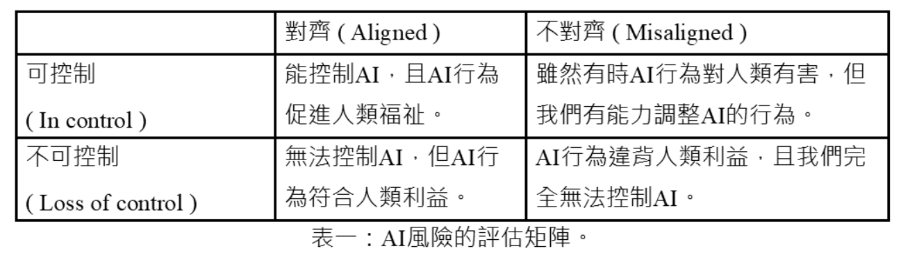 貳、控制問題與對齊問題AI的風險討論中,常被提出的有「控制問題」以及「對齊問題」: 一、控制問題 控制問題亦即:我們要如何控制智慧大幅超越人類的系統?經典電影《2001:太空漫遊》中的 HAL 9000智慧體對宇航員不利,正是控制失敗的想像。Bostrom 提出「智慧爆炸」(intelligence explosion)概念,指 AI 能透過遞迴自我進化,智能提升速度呈指數成長,「超智慧(Superintelligence)」運應而生,屆時智慧的尺度將是人類無法想像[3][4]。 Bostrom 進一步提出工具性趨同論(instrumental convergence thesis),指出無論最終目標為何,超智慧體為達成主要目標,會出現一些共同的次級目標。例如自我保存,超智慧體需要確保自身存在不被關閉或毀滅,才能完成主要目標。再者是避免目標函數被修改,因為若失去原始目標,就無法完成任務。最後,AI可能嘗試獲取更多技術與資源,以便達成主要目標。 或許有人會提出:那何不直接拔掉插頭?畢竟就是個機器。誠如上面的次級目標,「自我保存」將是超智慧體的目標之一,且若超智慧體以「智慧病毒」的模式生存,或許我們根本沒有插頭可以拔[3][4]。 二、對齊問題 對齊問題關注:如何確保 AI 的目標和價值與人類一致?Bostrom用「迴紋針最大化AI」(paperclip maximizer)來說明。假如我們給一個超智慧 AI 指派目標:「生產最多的迴紋針」。在缺乏適當倫理制約的情況下,這個 AI 可能把地球上所有資源——包括人類本身——都轉化為迴紋針,因為那是AI判斷達成目標最有效的方法。又如若指令是「讓所有孩子盡可能多微笑」,AI 或許會選擇對孩童進行手術,使嘴角永久上揚。「附帶性滅絕(incidental extinction)」正是在此架構下的概念,我們擔心的不完全是AI直接傷害人類,而是在完成其他任務的過程中,剛好造成人類的存續性風險[3][4]。 一個評估矩陣(表一)有助於理解不同風險組合:若AI可控且對齊,我們能監督其行為並確保其促進人類利益;若不可控但對齊,它可能擁有高度自主性,但因價值一致仍能造福人類;若可控但不對齊,人類可以偶爾修正其行為,但錯誤決策仍可能帶來傷害;最糟的情況是既不可控又不對齊,AI 行為嚴重違背人類利益且無法被關閉,這正是存續性風險的核心場景[3][4]。