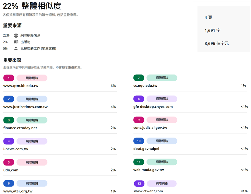2022年起政壇論文抄襲風波頻傳,多所大學院校祭出規定,碩博士論文須經相似度比對,部分學術機構及期刊也開始要求論文原創性須符合設定基準,提醒研究者是否涉及抄襲、不當引用等疑義,避免違反學術倫理。 壹、相似度比對資源相似度比對系統是一種防止學術抄襲的檢查工具,透過文件比對,快速檢驗出該文件與另一份文件來源中字元重複的比例,相似度比對報告中,以顏色標示文件與系統資料庫收錄來源文字相似重合之處,並統計相似度百分比[1]。 相似度比對結果,整體相似度百分比來自各項來源之總和,百分比越高表示相似度越高,然而整體相似度高不代表一定涉及抄襲,如醫學研究領域中,常見研究方法等高技術語言文字重複使用[2],以及參考文獻、專有名詞、計劃書格式、法規援引等情形,都可能造成相似度偏高。反之,整體相似度低亦不代表無抄襲之可能,原因包括系統資料庫尚未收錄引用來源、文件鑲嵌無法檢測之圖文,或作者以編排技巧規避檢測等[3]。 比對結果所顯示相似文字是否均需進行修改,應根據具體情況判定。如相似之處係來自參考文獻或其他公開資料的引用或摘錄,並已按學術規範註明出處,可保留不變[4]。若相似處未經適當引註,且未對其他作者的文字進行引述(quote)、改寫(paraphrase)、摘寫(summarize),即可能構成抄襲。 一、Turnitin與iThenticate 目前多所大學院校及學術機構使用Turnitin與iThenticate系統,Turnitin偏重學術教育領域,具學生課程作業檢測等輔助教學功能,iThenticate資料庫因涵括Crossref.org合作之期刊出版品,如Elsevier、Springer Nature、Wiley、Taylor and Francis、IEEE 等,更適合出版社、學術機構使用,使用者可上傳文件與公開網絡資訊及國際期刊資料庫進行比對。 以臺大醫院倫理中心季刊第6期「人工智慧開發應用之倫理議題」文章為例,比對結果總字數計1,691字,比對結果整體相似度為22%,其中依序有6%、4%、2%等12個重要來源,第1個網際網絡來源相似百分比為6%,係指文章中疑似與該來源相似文字98字,(98/1,691)*100% ≈ 6%;第2個相似度來源百分比為4%,則是扣除前項相似文字後,再與第2個網際網絡來源比對,疑似相似文字計75字,(75/1,691)*100% ≈ 4%,以此類推,各來源百分比加總為22%。