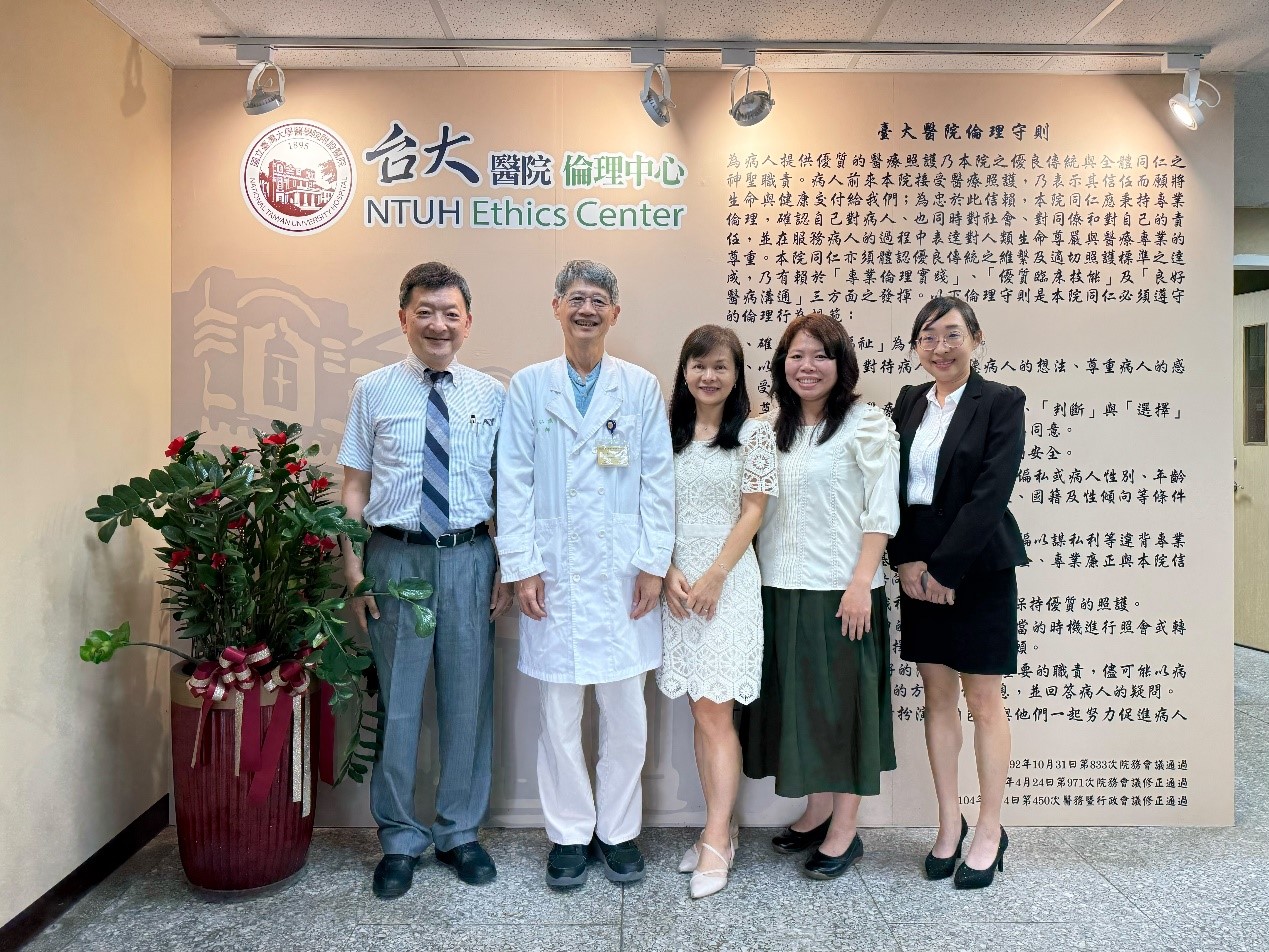 圖三 何弘能教授與臺大醫院倫理中心同仁合影(左1-蔡甫昌主任、左2-何弘能教授、右3-戴君芳副主任、右1-江翠如組長右2-研究倫理組陳依煜管理師)
