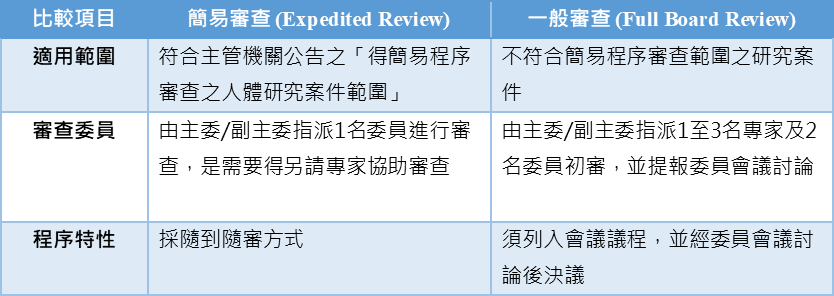 下表根據本會標準作業程序書,彙整兩種審查方式之差異: