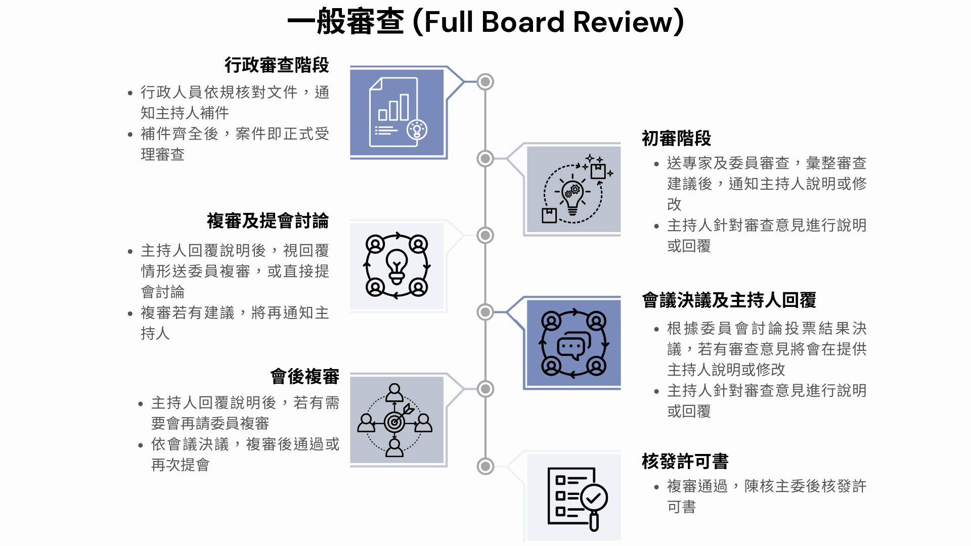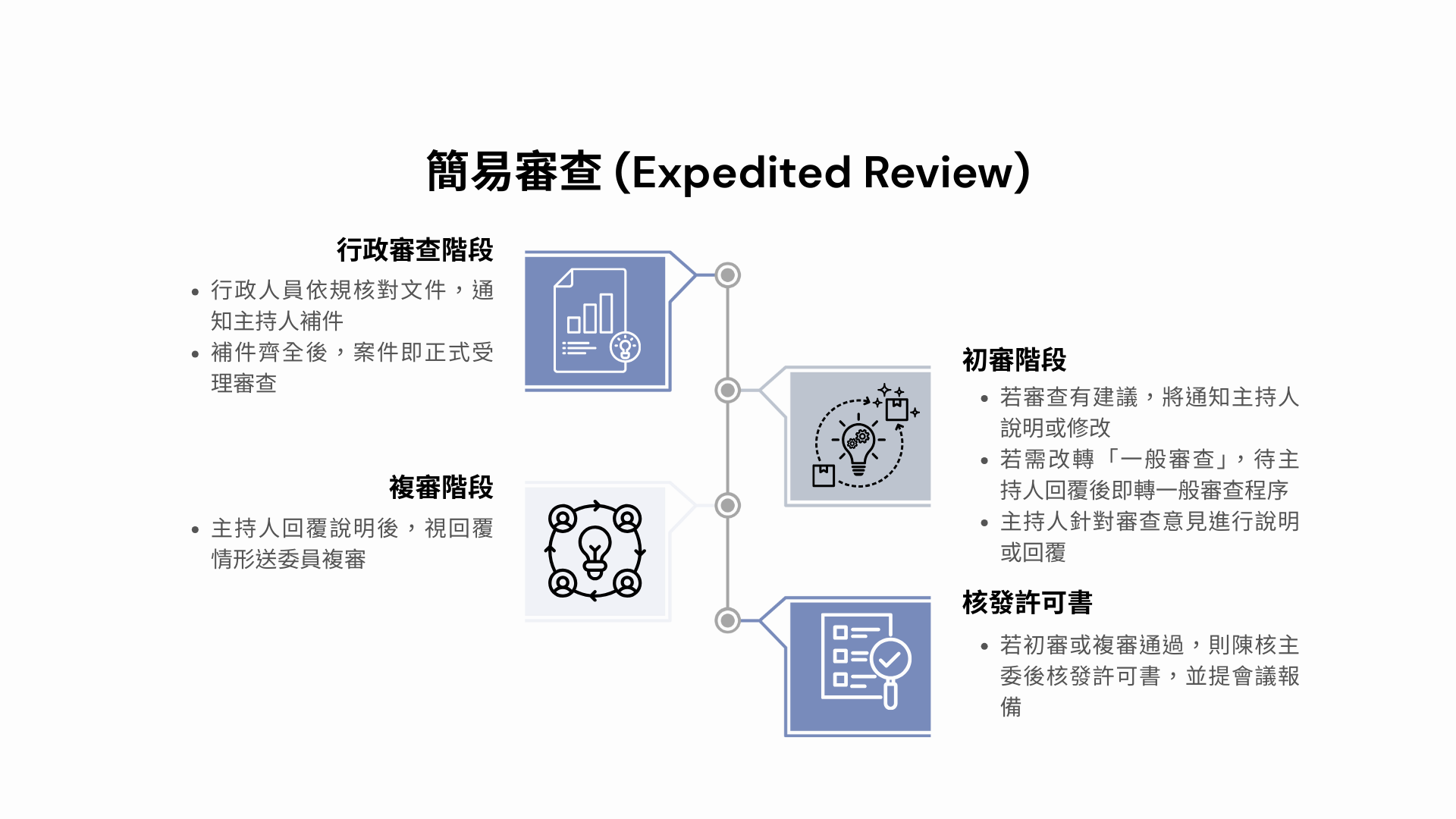 審查程序的快慢並非首要考量,核心目標在於依據研究的實質風險,提供對應深度的審查,以落實受試者保護,也兼顧審查資源的最有效運用。研究者於申請前若能詳閱「案件審查重點注意事項檢核表」,將有助於文件準備之完整性,並提升審查效率。