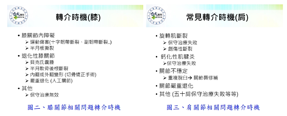 最後,無論是膝關節或肩關節的運動傷害,只要在門診或診所接受保守治療後,症狀未改善或持續性疼痛,都應及早轉介至醫院進行更詳細的檢查與評估,以利接受合適的微創手術或其他治療。