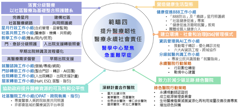 其中,分級醫療暨轉銜照護管理中心(RMC)負責執行範疇四「社會責任、醫療永續」,並透過與各醫療院所的合作,聚焦於以下重點方向: