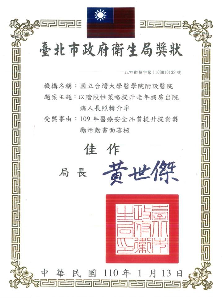 台北市衛生局-109年醫療安全品質提升提案獎勵活動書面審核佳作