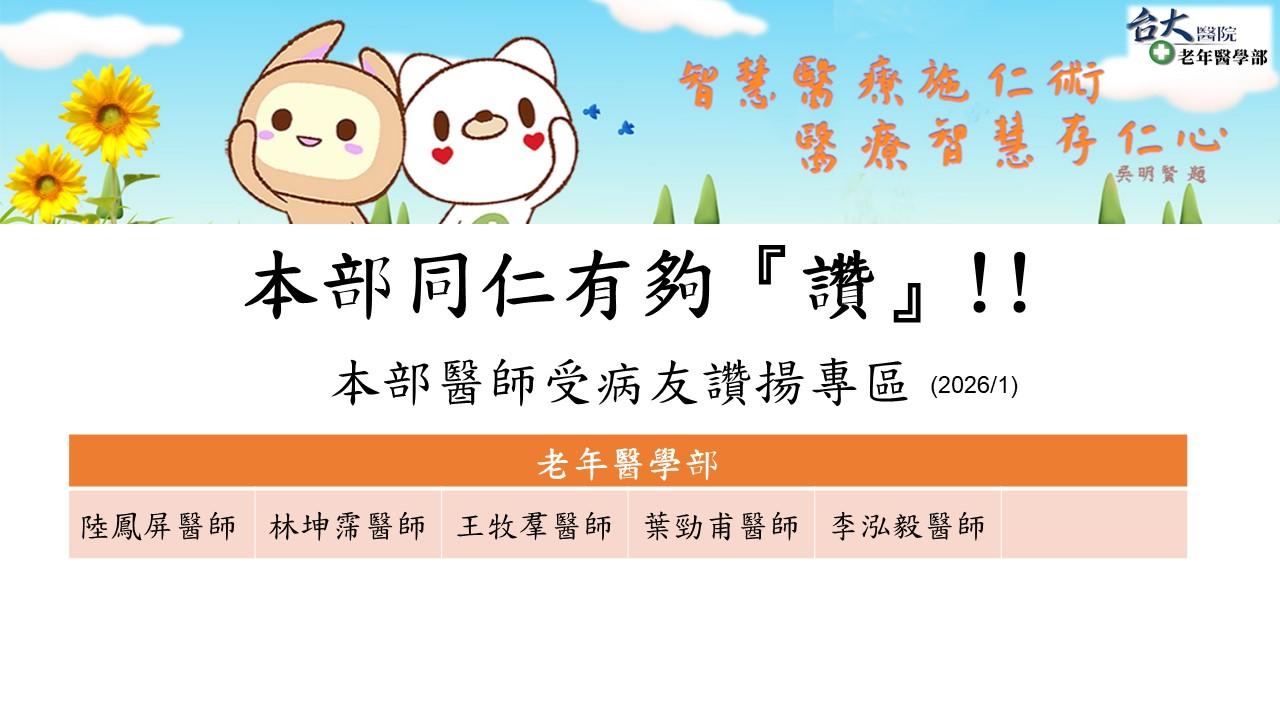 老年醫學部門診簡介:依老年人罹病情況、失能程度、家庭或社會資源、恢復潛力等狀況之不同,提供「以老人為中心」的整合性臨床服務,期使老人獲得完整而連續性之服務。