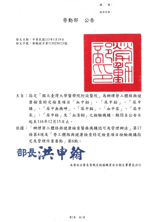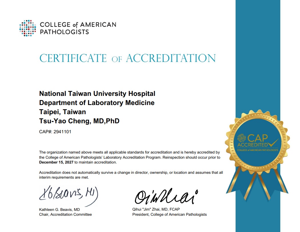 | 分子檢驗 | 血液腫瘤及一般腫瘤診斷與相關治療之分子遺傳檢驗、遺傳型血液疾病基因與藥物、感染相關基因之檢測、人類白血球組織抗原定序分析、病毒分子生物檢測。 |