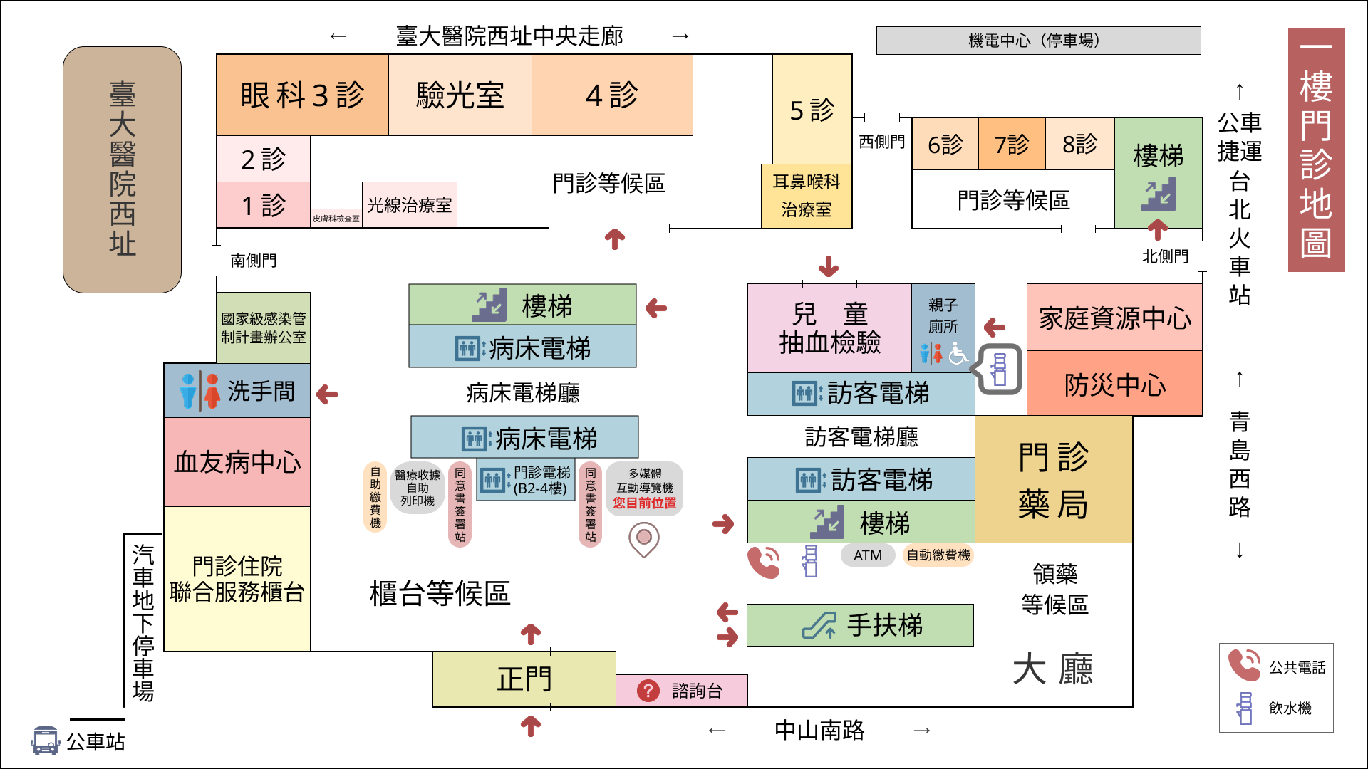 由中山南路正門入口進入兒童醫院,入口處為兒童醫院的大廳,右邊為門診藥局、領藥等候區,左邊為門診住院聯合服務櫃檯、血友病中心,正前方為門診電梯,可搭至地下一樓或1~4樓,電梯右側走道走到底,右邊為抽血檢驗、家庭資源中心、兒童門診6-8診看診區,左邊為兒童皮膚科/眼科/耳鼻喉科門診1-5診看診區。