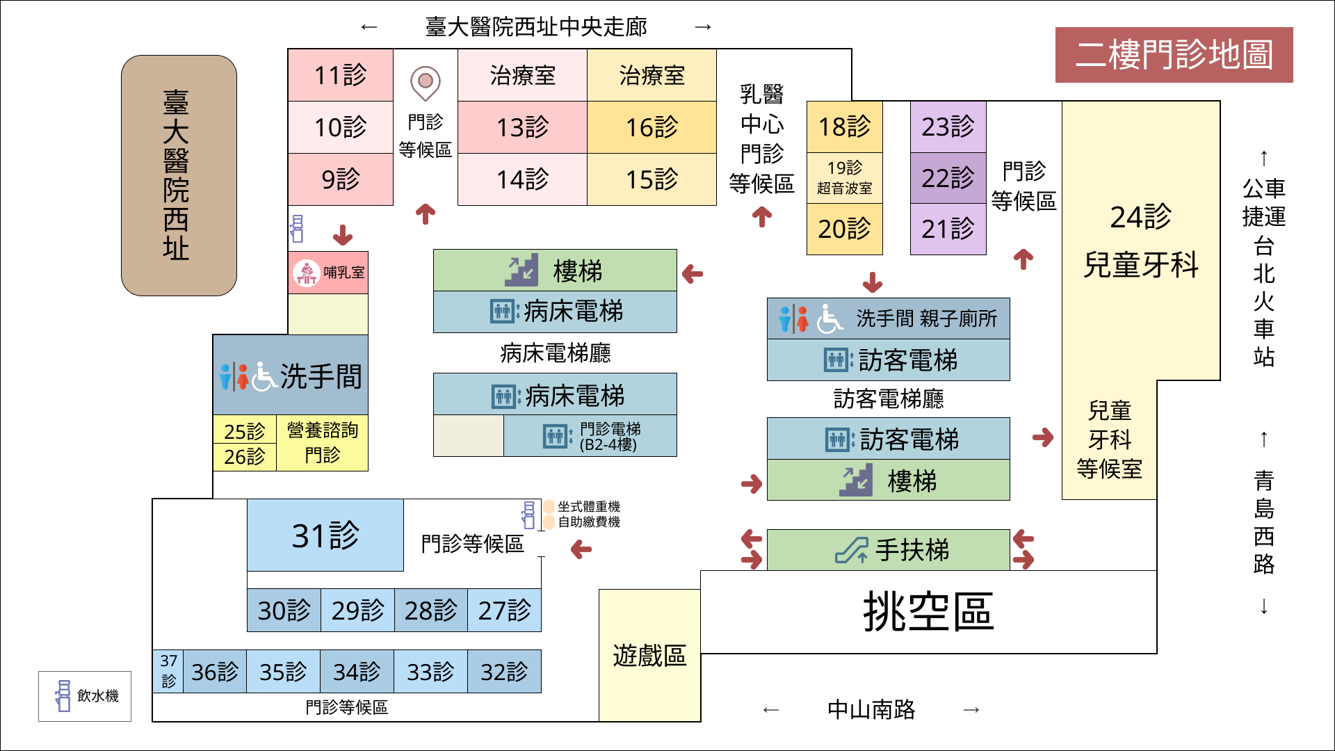 由中山南路正門入口進入兒童醫院,入口處為兒童醫院的大廳,正前方為門診電梯,搭乘本電梯到2樓後,正前方為兒童門診27~37診看診區、左邊為兒童牙科門診看診區、左後方為乳醫中心門診看診區,面對乳醫中心門診,右邊為兒童門診21~23診看診區、左邊為兒童門診9~14診看診區。