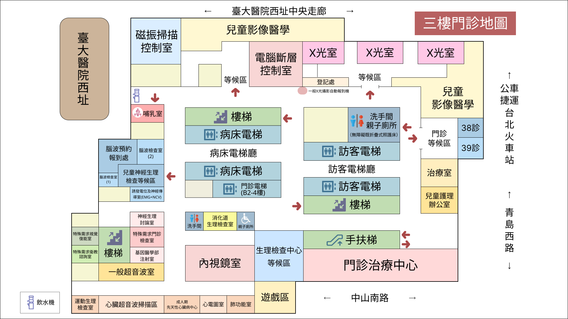 由中山南路正門入口進入兒童醫院,入口處為兒童醫院的大廳,正前方為門診電梯,搭乘本電梯到3樓後,正前方為生理檢查中心等候區、肺功能室、心電圖室、成人期先天性心臟病中心、心臟超音波掃描區,左邊為門診治療中心、右邊為神經生理檢查室、誘發電位檢查室、兒童神經檢查室、腦波檢查室,左後方為兒童X光室、核磁共振室。