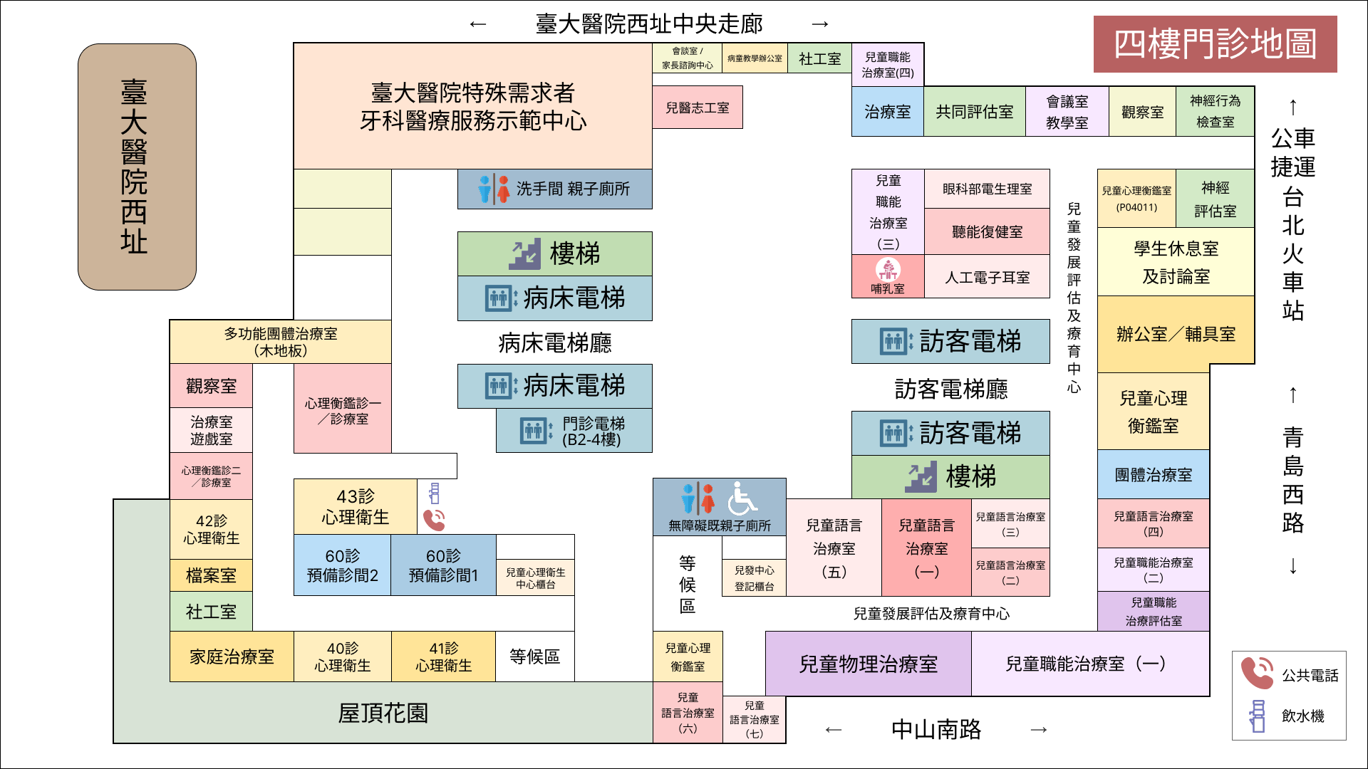 由中山南路正門入口進入兒童醫院,入口處為兒童醫院的大廳,正前方為門診電梯,搭乘本電梯到4樓後,左前方為兒童復健治療門診看診區,右前方為兒童心理衛生中心門診看診區,左後方為早期療育中心治療室,右後方為特殊需求者牙科醫療服務示範中心看診區。