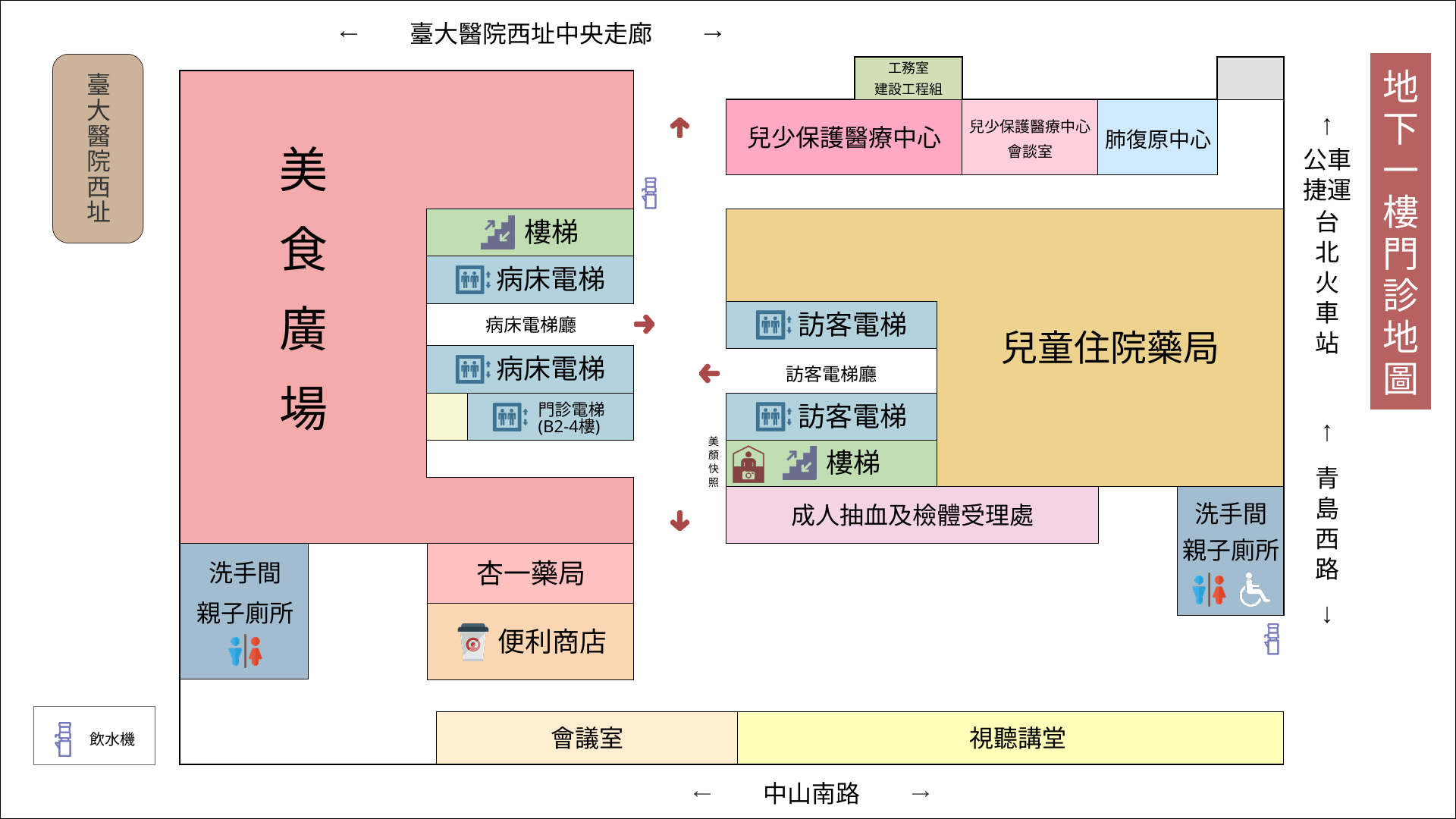 由中山南路正門入口進入兒童醫院,入口處為兒童醫院的大廳,正前方為門診電梯,搭乘本電梯到B1樓後,左前方為成人抽血及檢驗受理處,右前方為藥局及便利商店,左後方為兒童住院藥局及兒少保護中心,右後方為美食廣場。