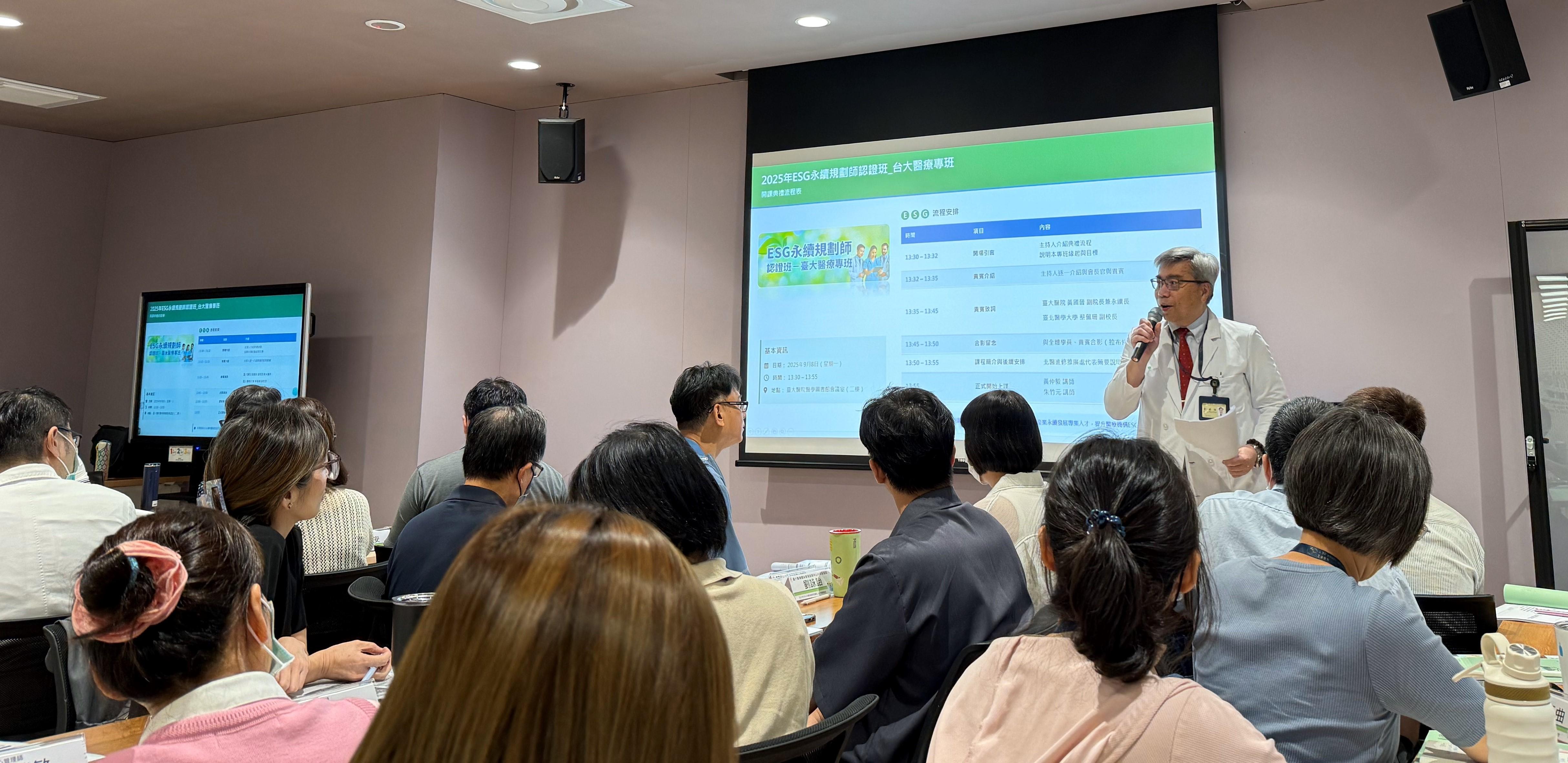 ESG永續規劃師-台大醫療專班開班:黃國晉副院長兼永續長蒞臨指導與勉勵ESG學員
