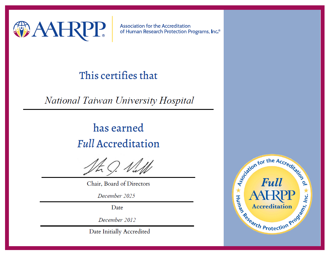 美國臨床研究受試者保護協會(AAHRPP)評鑑,獲頒全部通過(Full Accreditation) |